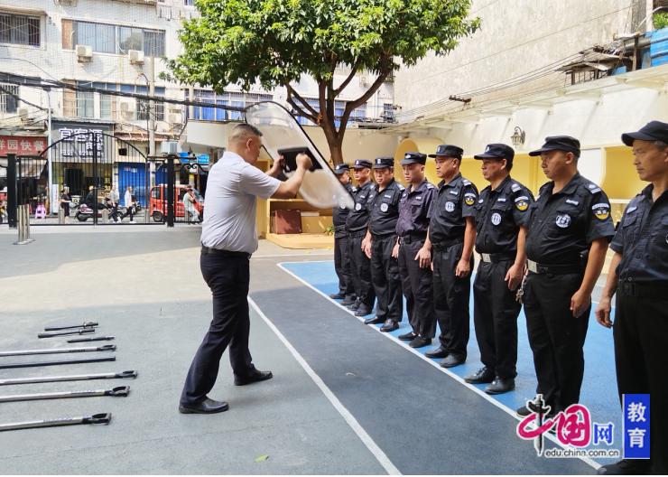 为确保园区设备平安无虞,严阵以待,通过培训,细致并实操盾牌的防御取推进技巧、防暴钢又的节制方式、防暴棍的击打取拦截动做,孩子上下学期间认实执勤,